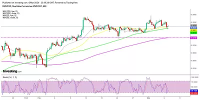 Le taux de change entre le franc suisse (CHF) et le dollar américain (USD) a maintenu une stabilité remarquable, fluctuant dans une fourchette d'un cent pendant environ un mois. Cette constance masque cependant une incertitude palpable liée aux politiques monétaires de la Banque Nationale Suisse (SNB) et de la Réserve Fédérale américaine (FED), surtout en ce qui concerne les ajustements des taux d'intérêt. Récemment, une baisse notable dans cette paire de devises a été observée, poussant à l'initiation d'un signal d'achat pour le USD/CHF, le prix trouvant un soutien notable dans le graphique H4.