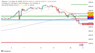 Le prix d'Ethereum se négocie actuellement en dessous de niveaux de support clés, incluant la marque de 3 350 $ et la moyenne mobile sur 100 heures. Une résistance immédiate se situe autour de 3 280 $, avec un obstacle conséquent à 3 350 $. Franchir ce seuil sera décisif pour toute dynamique haussière.